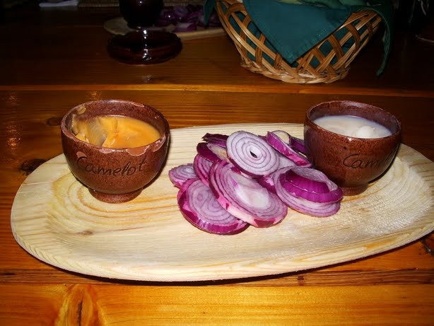 Sorin had recommended a nearby restaurant, so three of us set out to find the place to see how convenient it truly was. It was pretty close, so several of us gathered at 5:30 for the short walk. The appetizer was a Romanian specialty: toasted bread, purple onion and two spreads, lard with paprika or plain lard. It’s not what we are used to, but I bet our ancestors loved it.